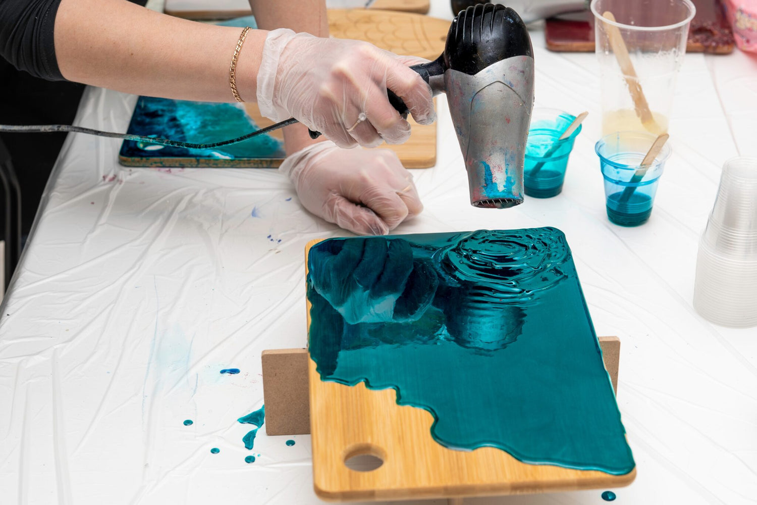 Sie fragte mich ob Sie auch mal was giessen kann mit Resin und ein Acryl pouring, dann wurden meine Augen nicht groß sondern riesig gross. Da war ich hin und weg und musste gestehen, dass mir Ihr Acrylbild und das Schneidebrett besser gefallen hat als meines. Da beschlossen wir Kurse zu machen und fuhren bis Wien, nach Bregenz, dann mehrmals nach Deutschland und in die Schweiz. Es war immer ein Erlebnis.