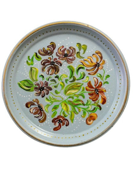 Blumen wie Dahlien , Rosen und viele Blätter gestalten das Tablett liebevoll das von Hand bemalen wurde.