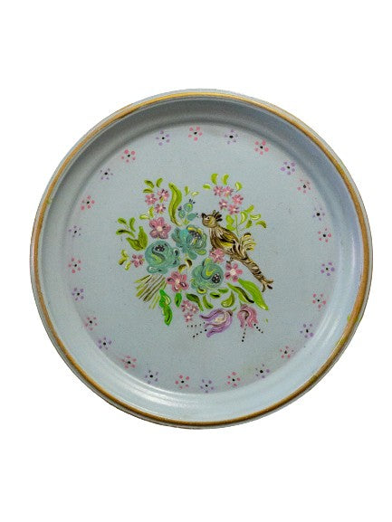 Blaues rundes Holz Tablett mit moderner Bauernmalerei.