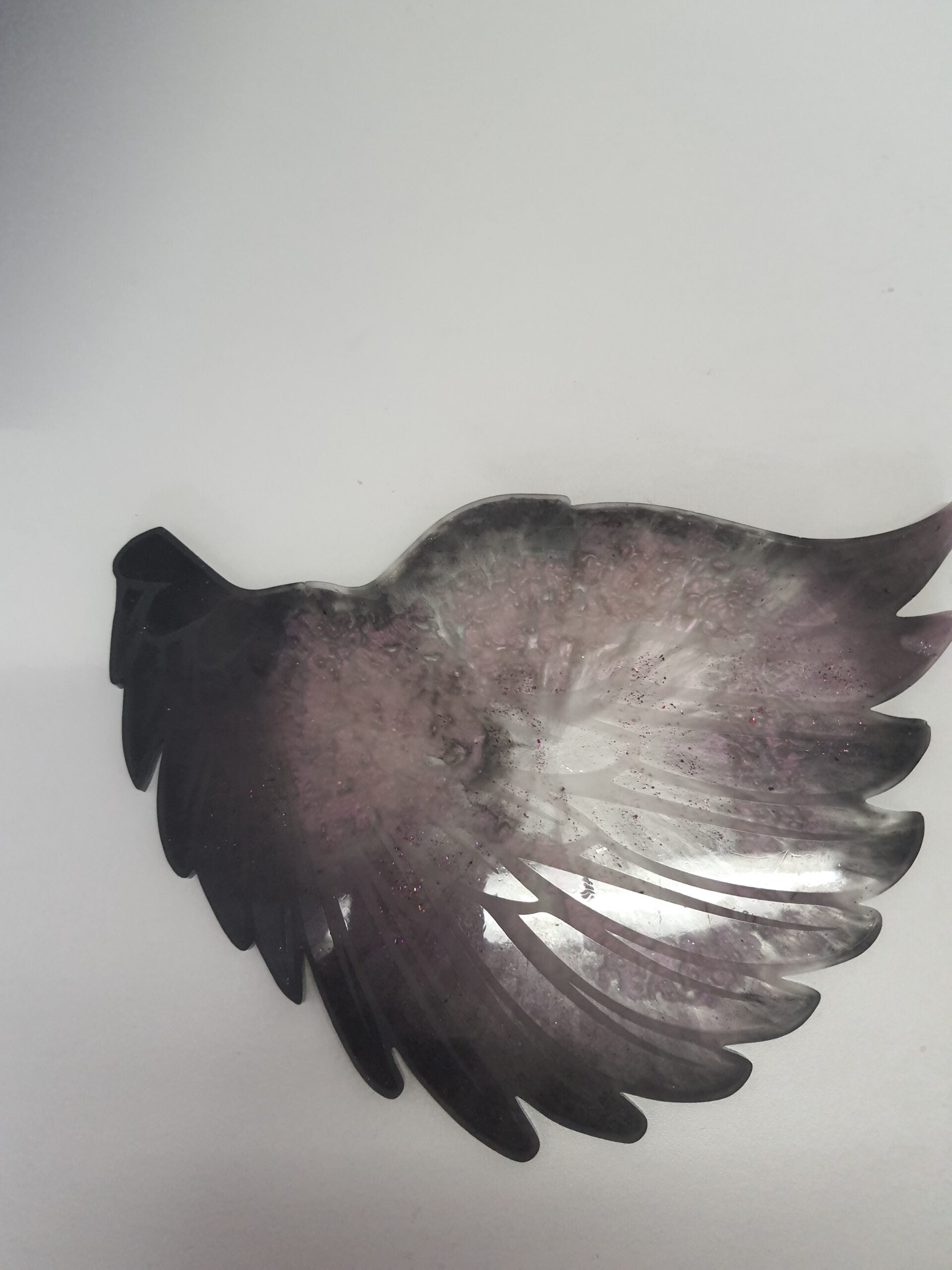 Engelflügel aus Künstlerharz in Grau, Schwarz und Rosa gehalten, mit Rosa Steinen verziert. Ideal als Untersetzer für Blumen oder auch als Untersetzer für Heferl Cafe oder Tee.