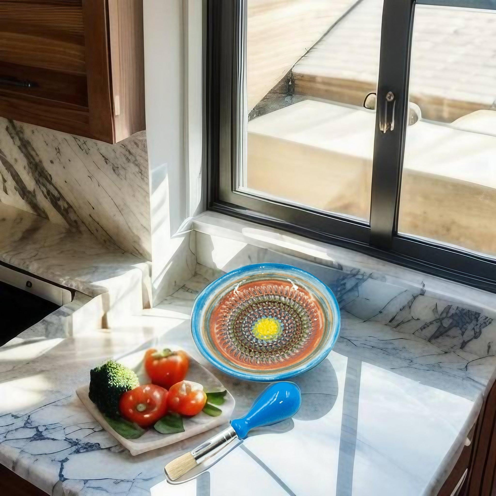 Der Keramik Reibeteller Mexiko ist ein innovatives Küchenwerkzeug, das das Reiben von Ingwer, Kurkuma, Zwiebel, Tomaten, Knoblauch, trockenes Brot und Semmeln, Parmesan, Muskatnuss, Äpfel, Zitrone und Orangen, Schokolade im Handumdrehen ermöglicht.