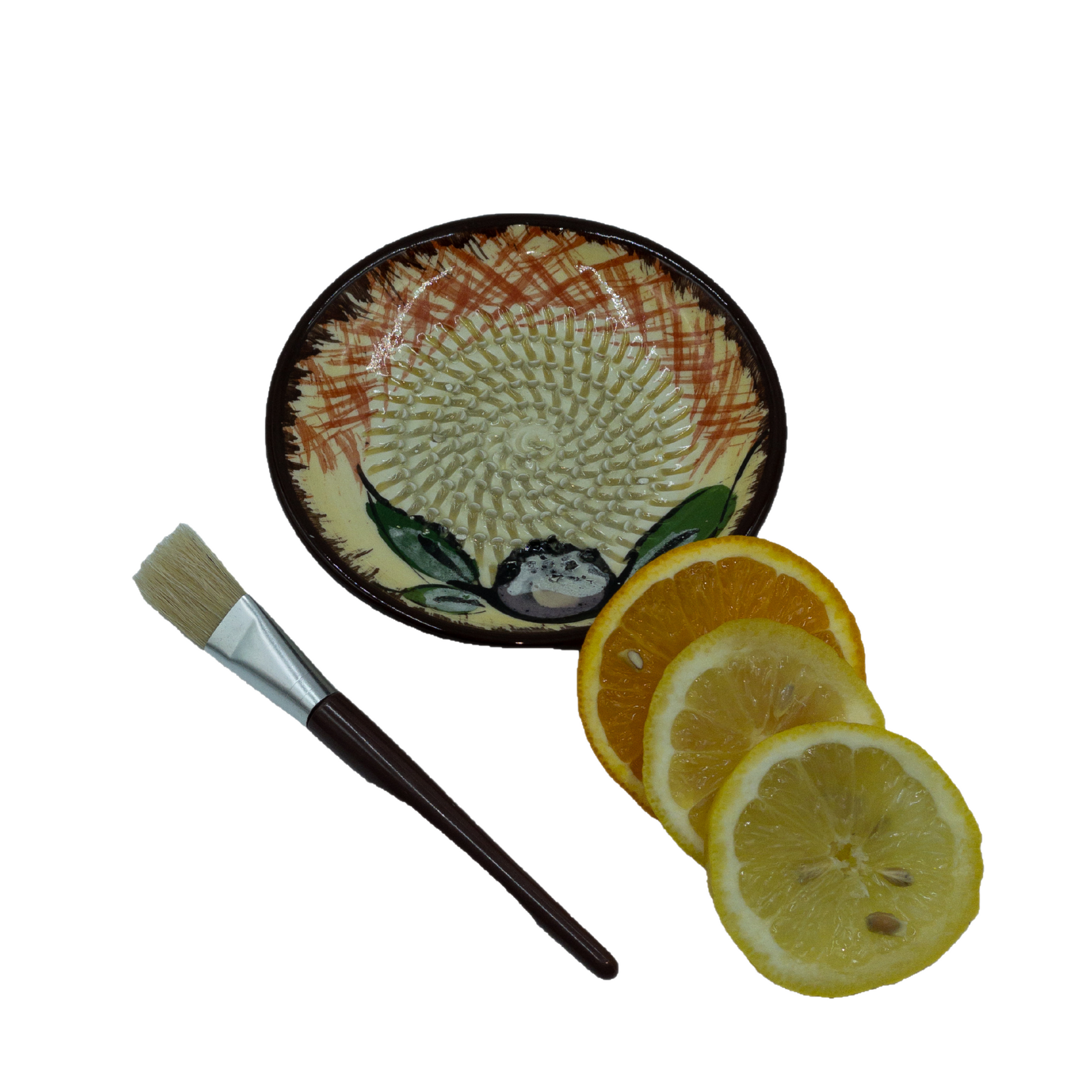 Die Reibeteller werden in Spanien von Hand hergestellt und bemalt. Jeder Reibeteller wird mit einem Pinsel geliefert, um das geriebene Produkt zu entnehmen.