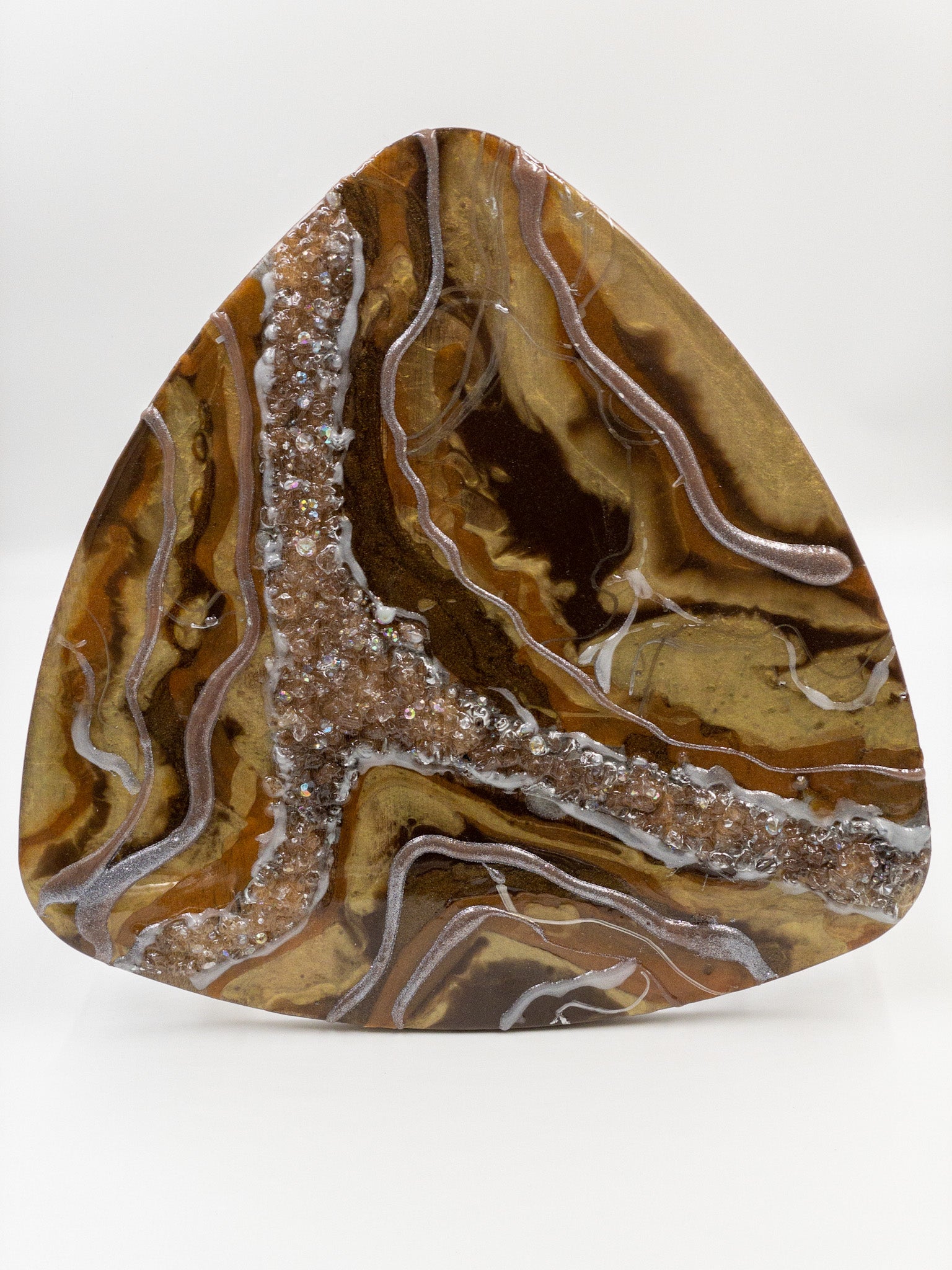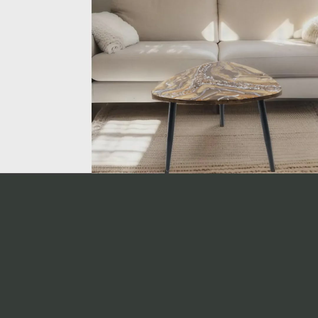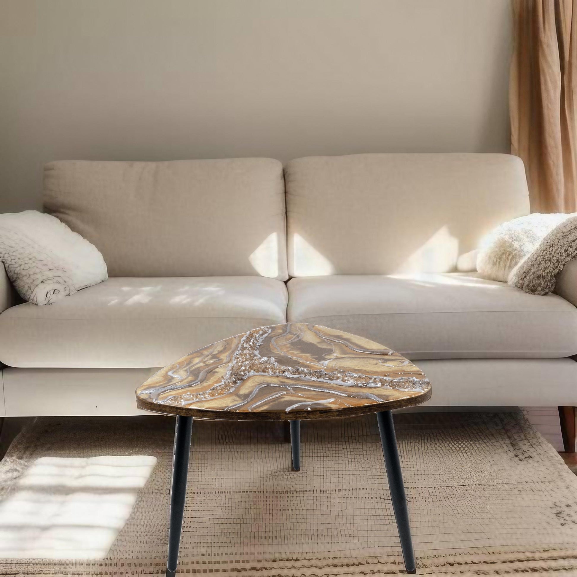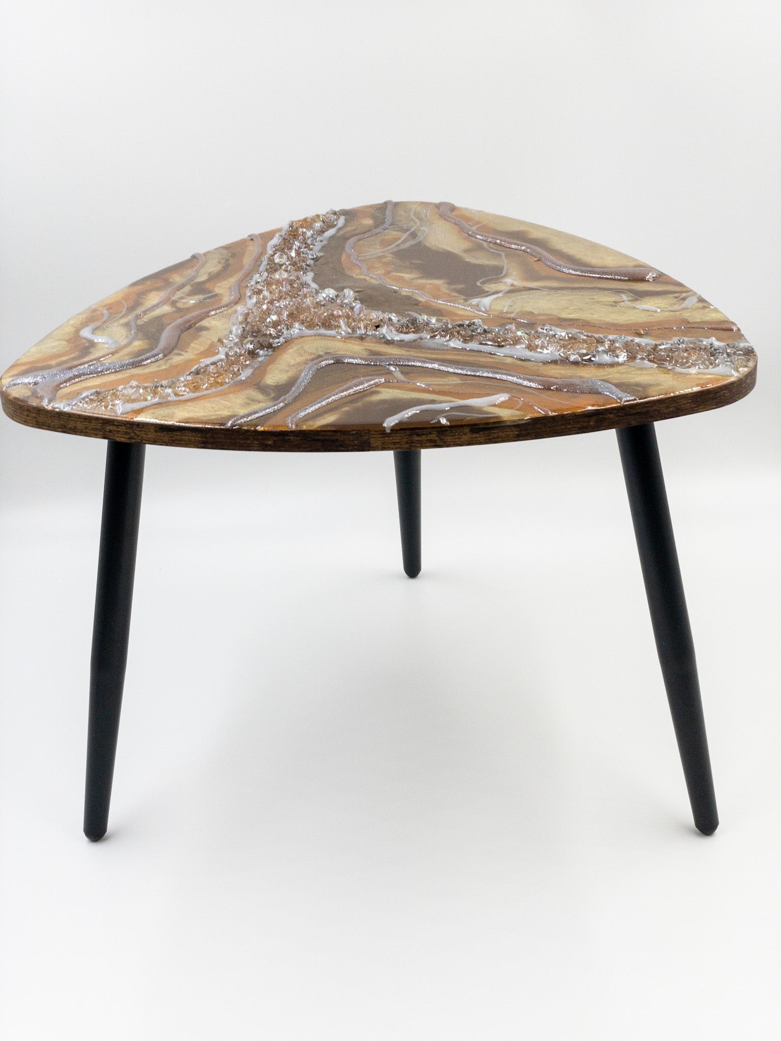Der Resin Beistelltisch besteht aus Holz mit mehreren Schichten Resin überzogen. Die Tischbeine sind aus Metall und in Schwarz gehalten. Mehrere Farben werden verwendet: Gold, Hell- und Dunkelbraun, Beige und Perlmuttweiß. Glassteine werden in Resin eingegossen und in braun-Kupfer gefärbt. Bitte keine schweren Gegenstände aufstellen. Der Tisch muss einfach nur zusammengesetzt werden; Füße im vorhandenen Gewinde anschrauben.