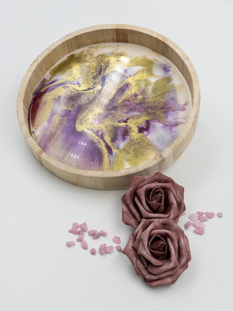 Das Tablett aus Bambus ist in den Farben Lila ,beige und Gold gehalten.