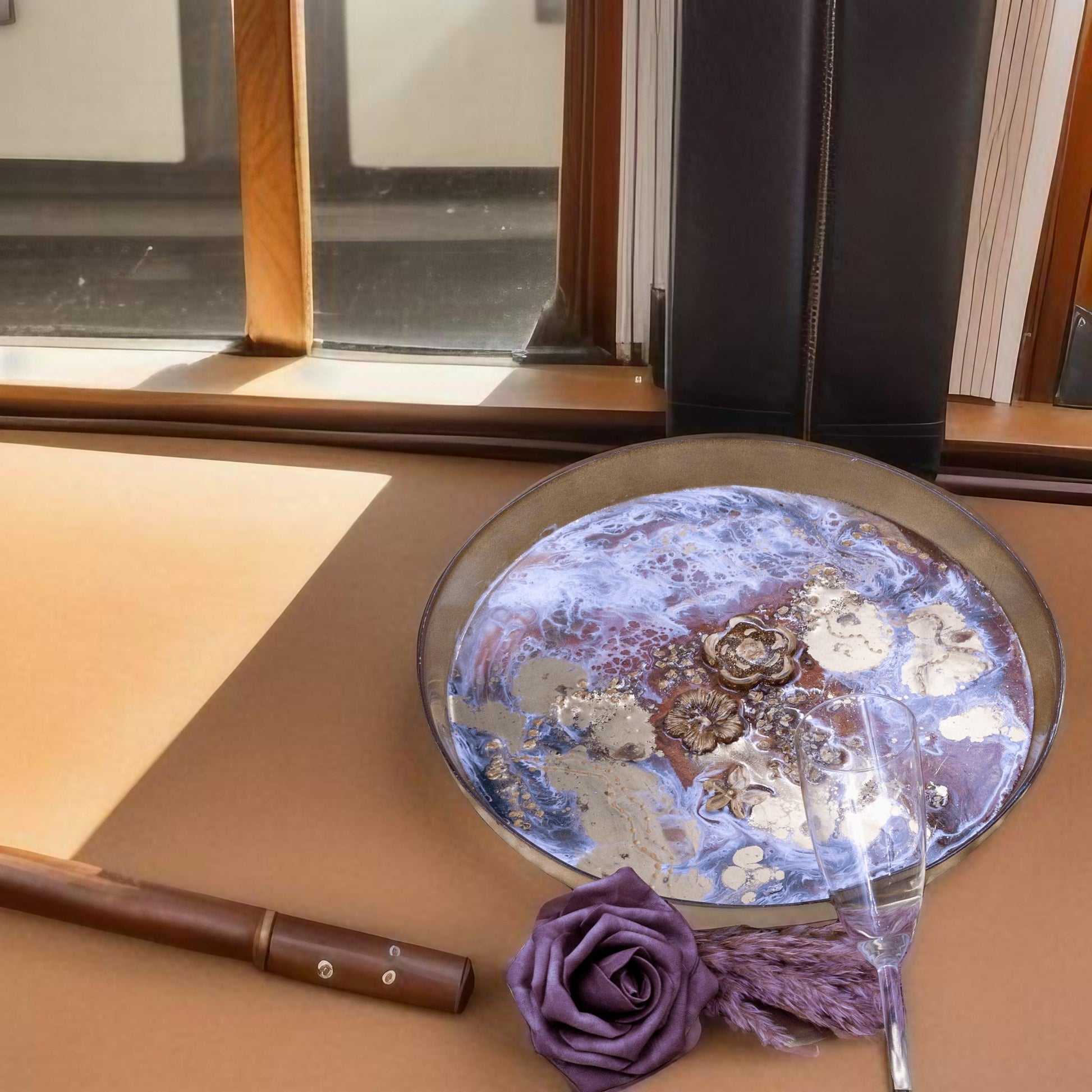 Dieses besondere ✨✨Tablett mit Glasaufbau in Bronze präsentiert selbstgemachte, detailreiche Resinblumen in den Farben Lila, Rosa, Bronze und Gold. Gekrönt wird das Kunstwerk durch die zentralen, bronze farbenen Resinblumen, die das einzigartige und extravagante Design des Tabletts perfektionieren. Mit einem Durchmesser von 30 cm ist das Tablett vielseitig einsetzbar. Der hier beschriebene Artikel ist das einzige, das verkauft wird. Abgebildetes Dekor und Zubehör dienen lediglich als Dekoration.